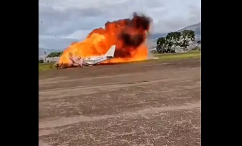 Avião tenta decolar, capota e explode em solo, na Venezuela