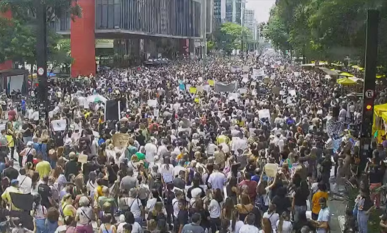 Ato na Avenida Paulista, em SP, neste domingo (1°), pede Justiça contra os agressores do cão Orelha, em Florianópolis, Santa Catarina — Foto: Reprodução/TV Globo