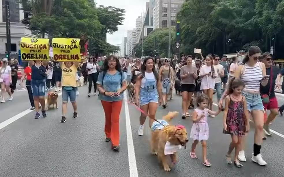 Manifestantes se reúnem na Avenida Paulista, Centro de SP, neste domingo (1°) em ato contra a agressão ao cão Orelha, em Florianópolis, Santa Catarina – Foto: Montagem/g1/Reprodução/TV Globo