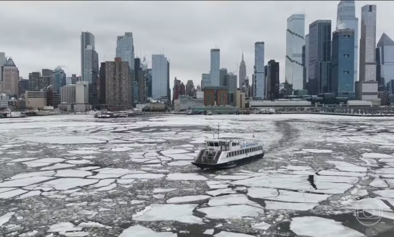 O Rio Hudson, em Nova York, ficou coberto por enormes placas de gelo. Uma visão rara. A câmera de segurança registrou a Times Square, cartão-postal da cidade, ser tomada pela neve em poucas horas. Em algumas áreas da cidade, o acúmulo de neve chegou a 40 cm. Nova York é a maior cidade dos Estados Unidos e as ruas ficaram praticamente vazias. Muitas linhas de ônibus deixaram de circular, e as autoridades pediram para as pessoas não saiam de casa. A nevasca passou, mas as temperaturas vão continuar a cair e devem se aproximar dos -20ºC.
