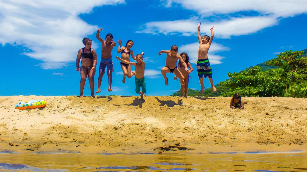 Crianças brincando na praia de Camburi das Pedras, em Ubatuba, litoral norte de São Paulo – Foto de Niceia Lira CC BY-SA 4.0