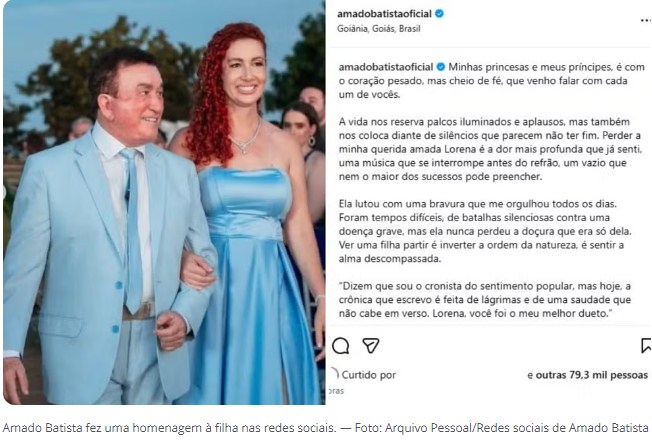 Na mensagem publicada, Amado escreveu que a perda da filha é a maior dor que já sentiu. “Perder a minha querida e amada Lorena é a dor mais profunda que já senti”, afirmou.