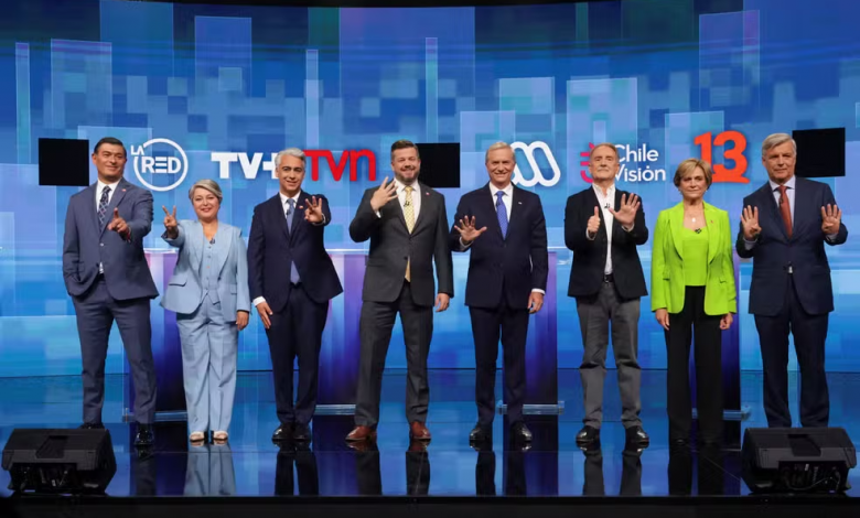Os candidatos presidenciais do Chile, Franco Parisi, Jeannette Jara, Marco Enriquez-Ominami, Johannes Kaiser, Jose Antonio Kast, Eduardo Artes, Evelyn Matthei e Mayne-Nicholls – Foto: REUTERS/Pablo Sanhueza