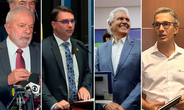 O Datafolha diz ainda que o nome de Lula é conhecido por 99% dos entrevistados. O de Flávio Bolsonaro, por 93% dos brasileiros. 56% dizem não saber quem é Zema, e 54%, Caiado.