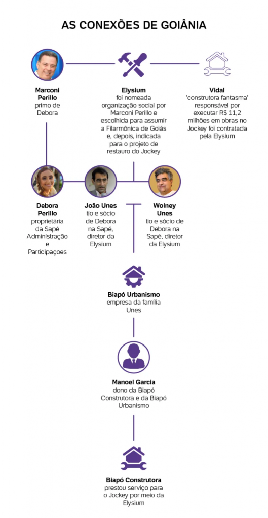 Parte dos valores foi destinada a empresas e pessoas próximas a Marconi Perillo, presidente nacional do PSDB e conselheiro do Jockey. Segundo apuração, ele indicou a produtora goiana Elysium para coordenar o restauro e contratar fornecedores.