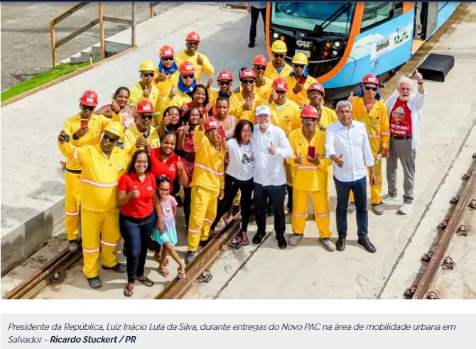 Lula participou hoje de entregas do Novo Programa de Aceleração do Crescimento (PAC) na área de mobilidade urbana em Salvador, na Bahia, e visitou obras de implantação do Veículo Leve sobre Trilhos (VLT) da capital baiana. Um trecho do transporte público já funciona em testes operacionais.