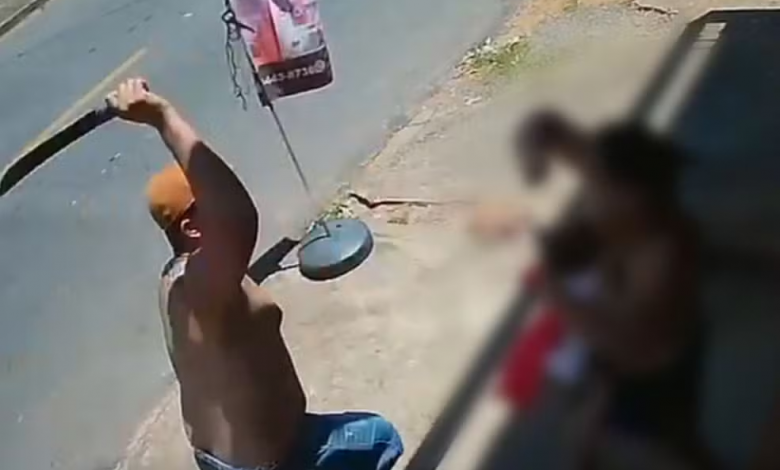 Uma mãe de 33 anos foi filmada por uma câmera de segurança sendo espancada com um facão pelo companheiro dela, de 35, em Aparecida de Goiânia, enquanto segurava a filha de 4 meses no colo. De acordo com a Polícia Militar, o suspeito foi encontrado e preso em flagrante pouco após o crime.
