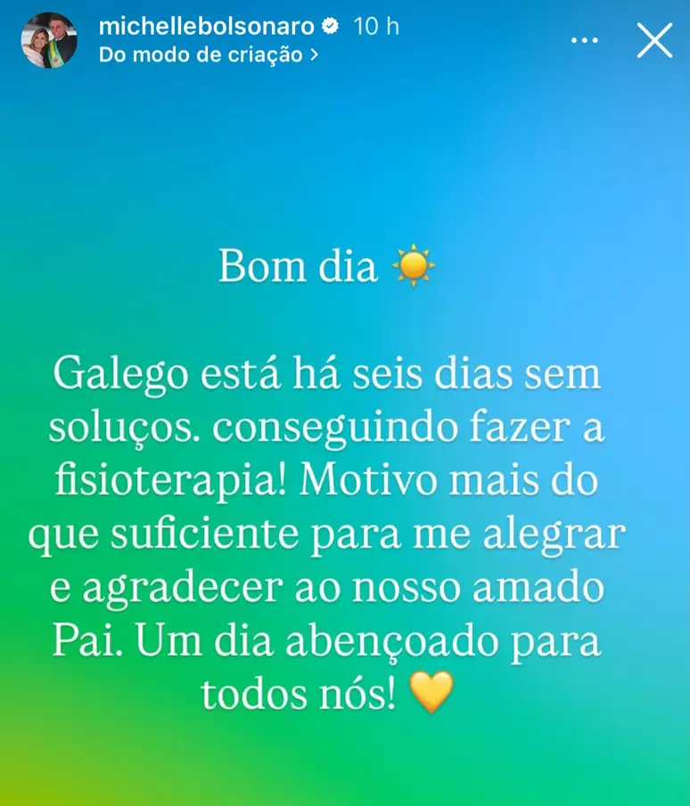 “Galego está há seis dias sem soluços, conseguindo fazer fisioterapia! Motivo mais do que suficiente para me alegrar e agradecer ao nosso amado Pai. Um dia abençoado para todos nós”, escreveu.