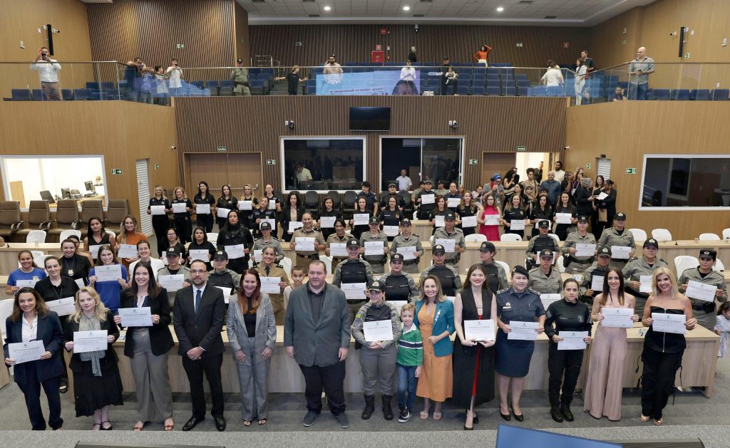 A Câmara Municipal de Aparecida de Goiânia realizou, na noite desta terça-feira (24), uma sessão solene em homenagem às mulheres ligadas à segurança pública que atuam no município. A iniciativa, de autoria da vereadora Camila Rosa, reconheceu 68 profissionais, entre elas delegadas, peritas criminais, agentes da Polícia Civil, da Polícia Militar, da Guarda Civil Municipal e da Patrulha Maria da Penha, pelo trabalho desempenhado com compromisso e dedicação na proteção da população aparecidense.