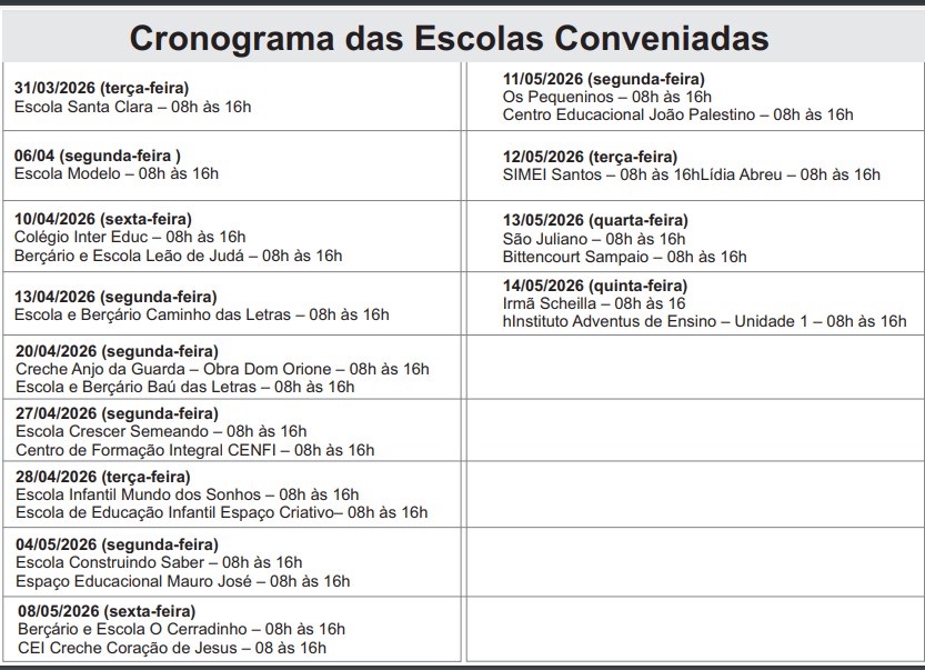 Segundo a coordenação de imunização, as equipes da SMS farão atendimentos presenciais nas unidades escolares com aplicação de todas as vacinas do calendário infantil, exceto BCG e vacina contra a dengue, que seguem disponíveis exclusivamente nas salas de vacina das unidades de saúde.