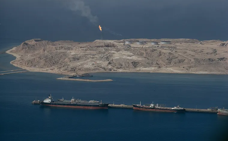 Navios-tanque esperando para serem abastecidos com petróleo próximos à ilha de Kharg, que fica no Golfo Pérsico e pertence ao Irã. O Estreito de Ormuz é responsável por mais de 80% do trânsito de petróleo produzido pelos países desta região do Oriente Médio – Foto: de Dean Conger