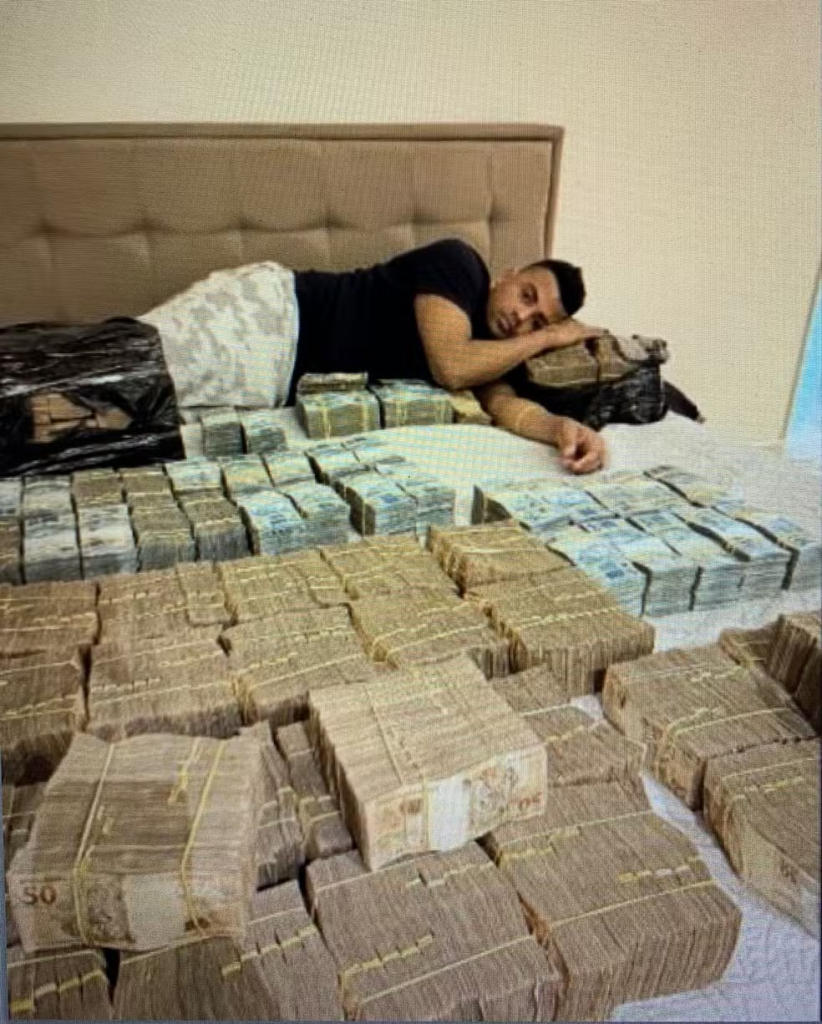 TH Joias deitado numa cama com maços de reais; PF suspeita que que valor seja de R$ 5 milhões – Foto: Reprodução
